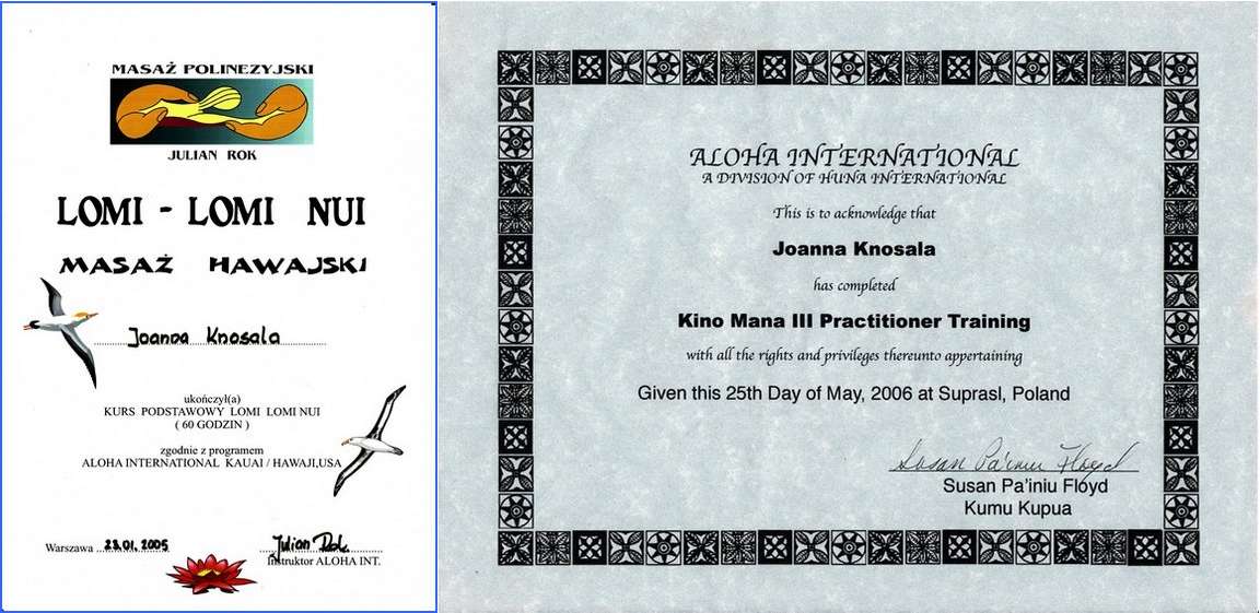 Podstawą do wykonywania przeze mnie masażu hawajskiego są certyfikaty z: